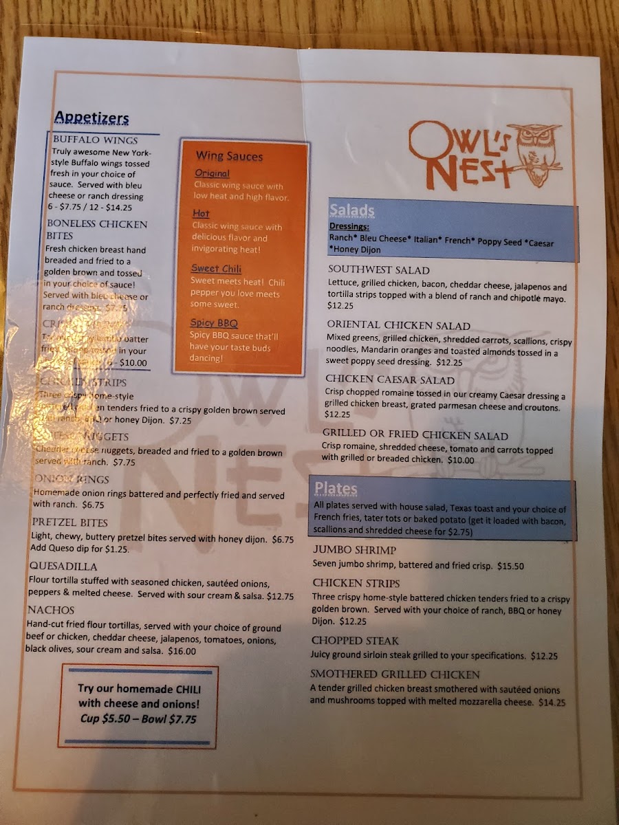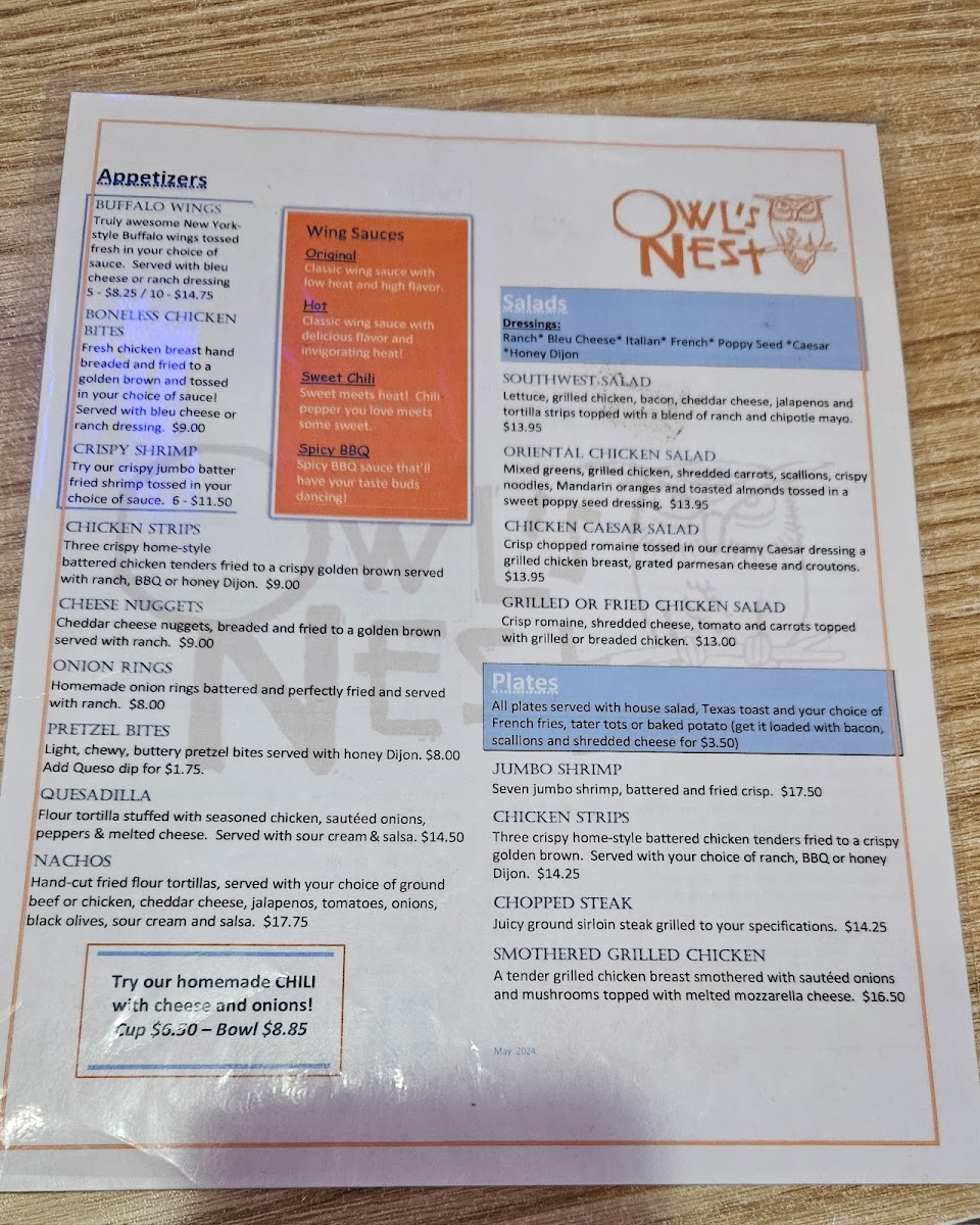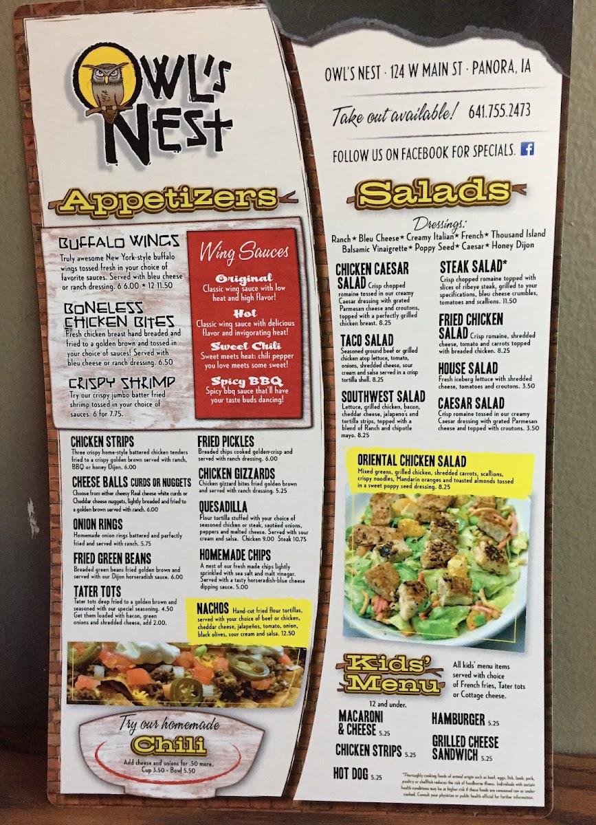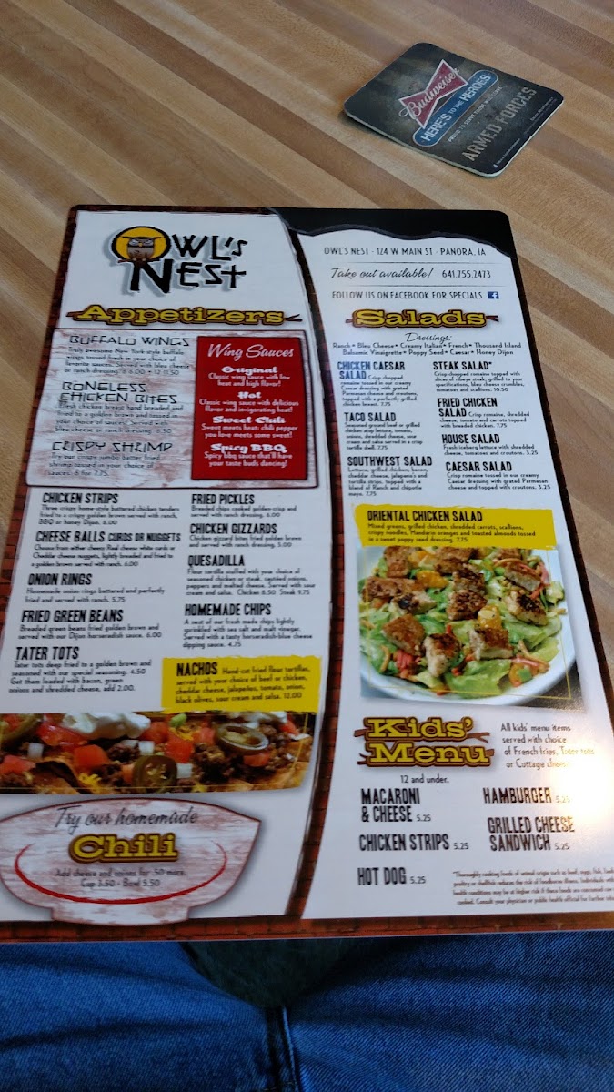Welcome to Owl's Nest Panora, a hidden gem in the heart of Panora, Iowa. Nestled at 124 W Main St, this local bar offers an enticing menu that caters to both casual diners and culinary enthusiasts alike. Patrons rave about the diverse selection, from fresh, crunchy salads to succulent grilled chicken, and an unforgettable tenderloin that stands out as one of the best you'll ever taste.